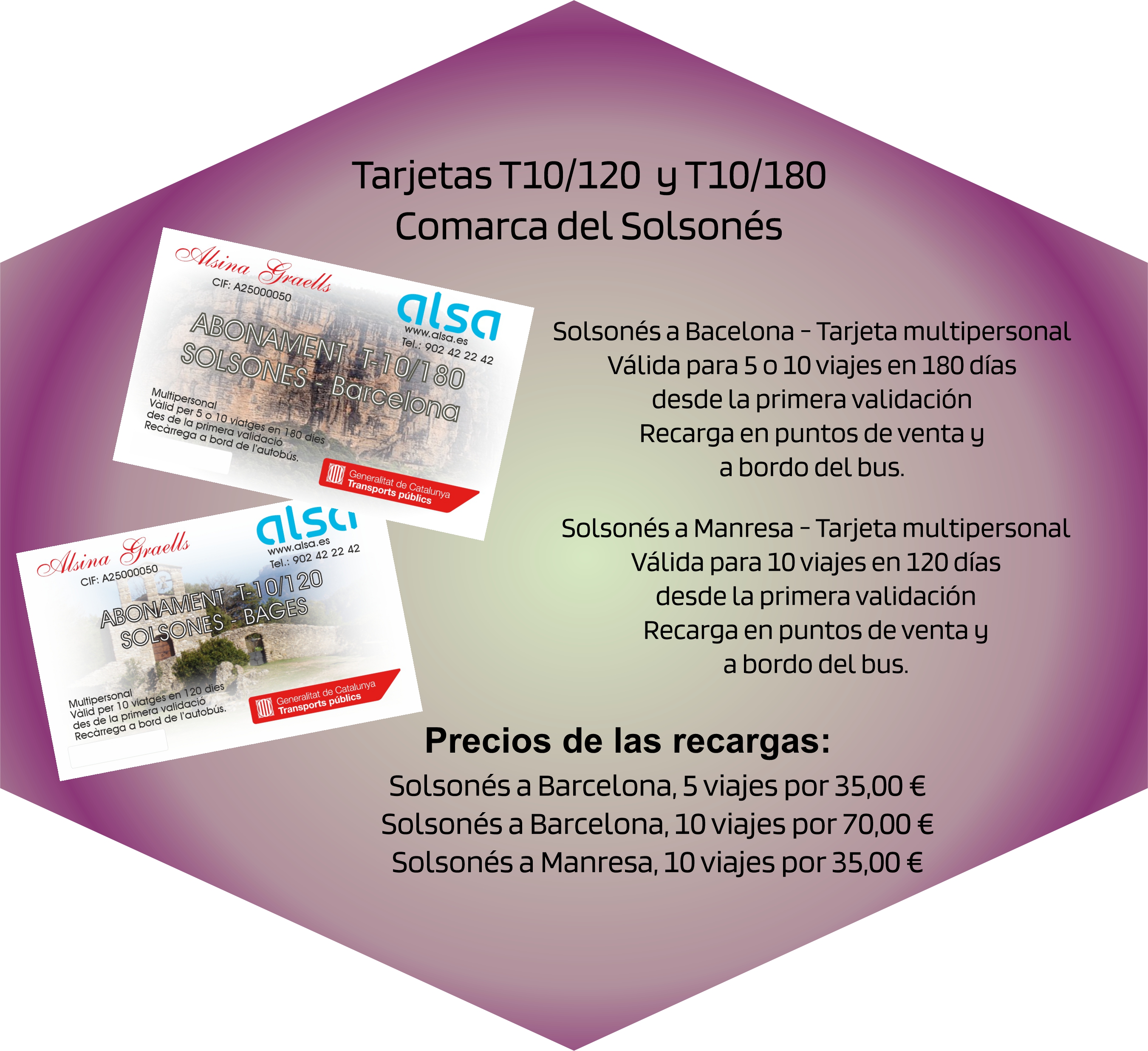 Si s'utilitza aquest servei es pot adquirir una targeta de multiviatges Solsona-Barcelona Barcelona-Solsona
